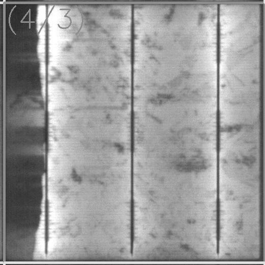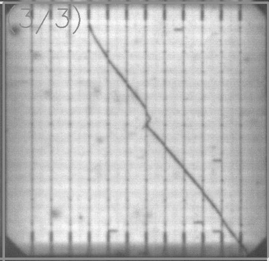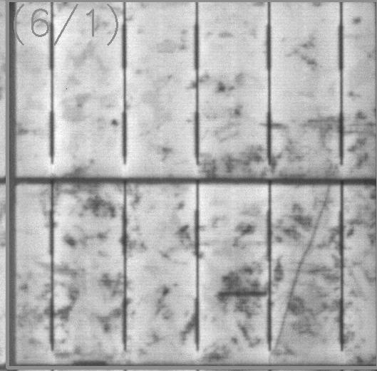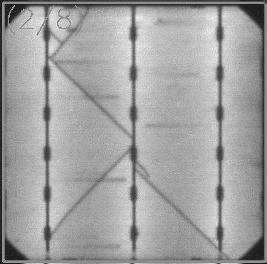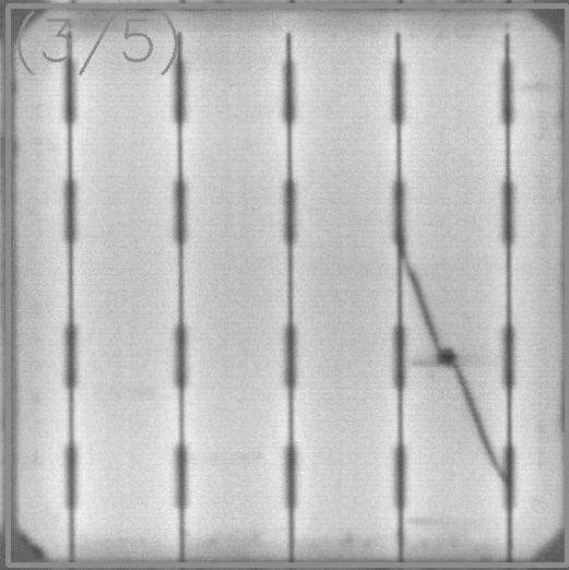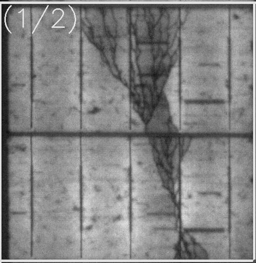 Een voorbeeld van een niet-kritische crack. De stroom die opgewekt wordt aan beide kanten van de micro crack kan afgevoerd worden naar de bus bars. Meer voorbeelden, ook van kritische en zeer kritische cracks zijn te vinden in de beoordelingscriteria.