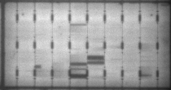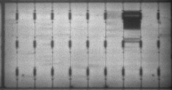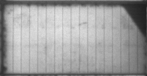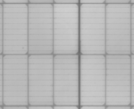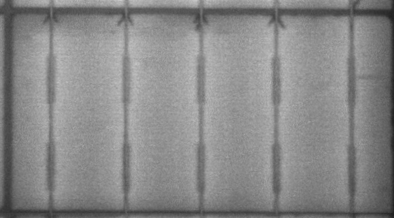 In addition to cracks, we also see other production faults very regularly, such as broken “fingers”. Fingers ensure the transmission of power from the cell material to the bus bars. Damage here can ultimately lead to reduced yield.These fingers are printed on the cell material by means of a screen printing process. In the example below, some of these fingers are improperly printed; these become visible as dark horizontal lines between the bus bars.