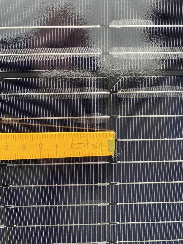 The most common defects are cracks on the bus bars, usually at the start of the bus bar. We have found a range of these cases, from tiny dots to cracks running through the entire cell. These cracks form during the soldering process and can, even with normal careful handling, develop into cracks across the entire length of the cell. When these cracks are located on the outside of the cell, i.e. outside the outer bus bar, they can isolate parts of the cell from the bus bar. At these places, the flow of energy slows down and hot spots can arise. Hot spots cause higher energy resistance and therefore a reduced yield. When the cracks are located between the bus bars, they are assessed as non-critical; when they are located on the outside of the cell, the crack can be assessed as critical, with the result that the panel is assessed as class B. When a panel has non-critical cracks in more than 10% of the cells, the module is assessed as class B.